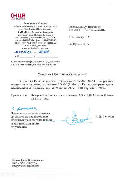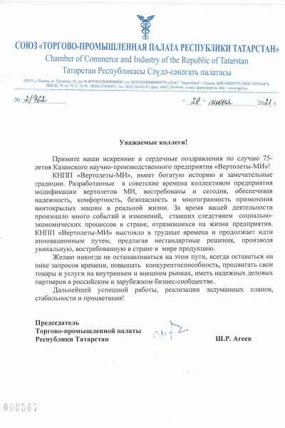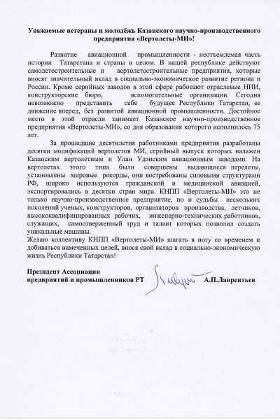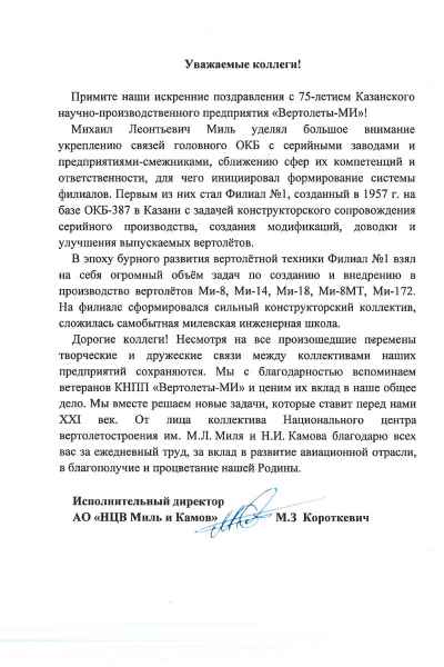 Давайте не останавливаться на достигнутом, вместе развиваться и идти в светлое будущее», - поблагодарил коллег за поздравления генеральный директор КНПП «Вертолеты-МИ» Коновалов Дмитрий Александрович.