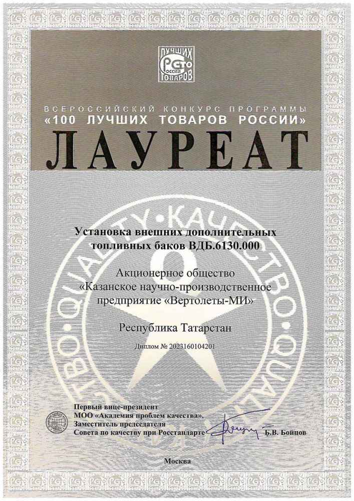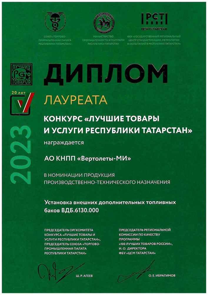 В рамках конкурса КНПП «Вертолеты-МИ» стало лауреатом на региональном и федеральном этапах с продукцией «Установка внешних дополнительных топливных баков ВДБ.6130.000» в номинации «Продукция производственно-технического назначения».