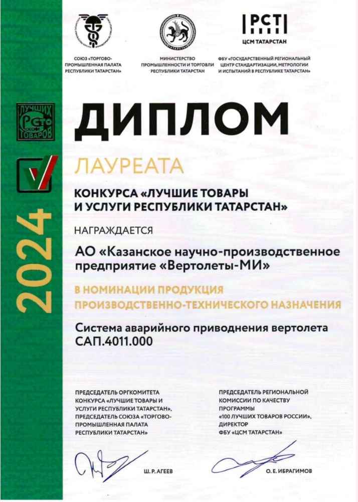 С радостью сообщаем, что продукция нашего предприятия, КНПП «Вертолеты-МИ», была удостоена диплома лауреата в рамках престижного конкурса «Лучшие товары и услуги Республики Татарстан». Этот конкурс организован Министерством промышленности и торговли Республики Татарстан и служит показателем высоких стандартов качества и инноваций.